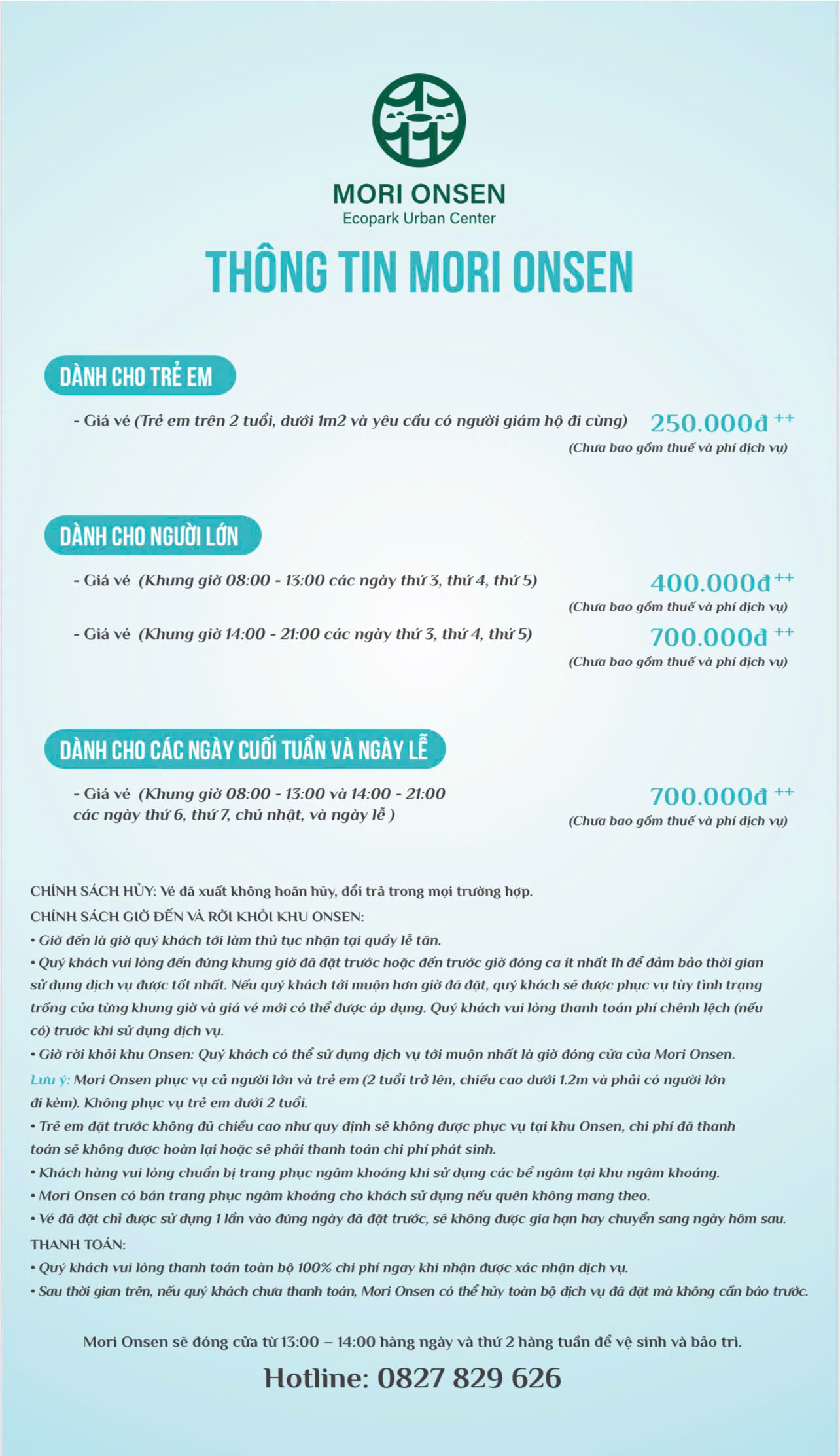 Lưu ý: Mori Onsen phục vụ cả người lớn và trẻ em (2 tuổi trở lên, chiều cao dưới 1.2m và phải có người lớn đi kèm). Không phục vụ trẻ em dưới 2 tuổi.